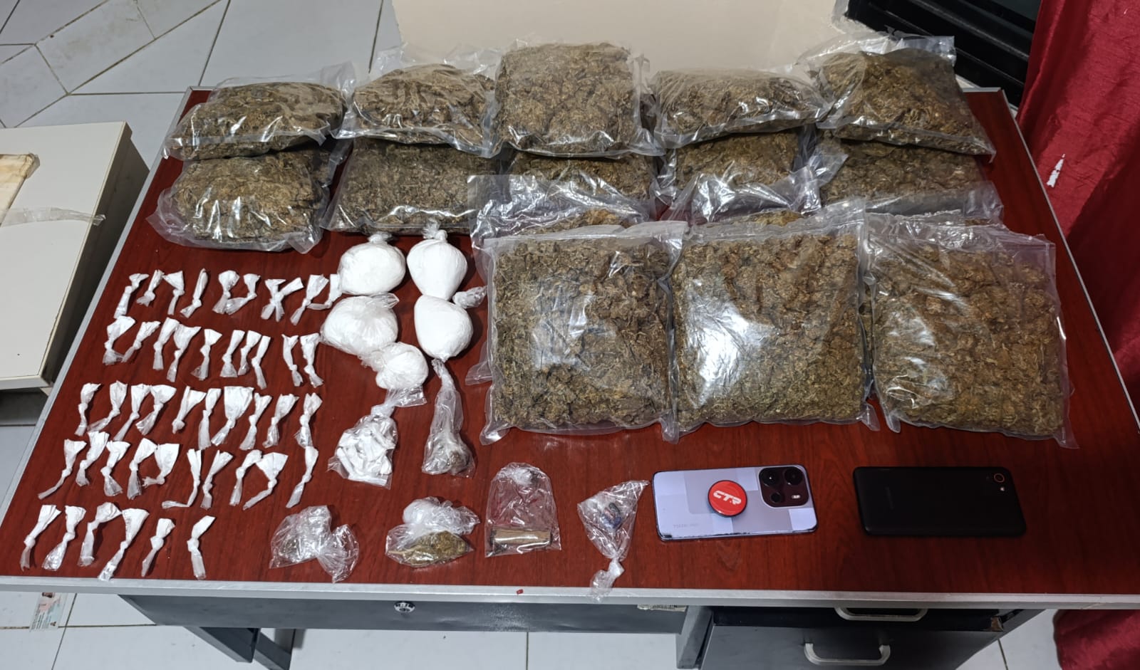 Durante el operativo, las unidades decomisaron un vehículo tipo sedán, 16 bolsas de marihuana de aproximadamente una libra cada una, así como múltiples dosis de presunta cocaína distribuidas en bolsas para su comercialización, además de cuatro pastillas que se presume contienen sustancias ilícitas y diversos equipos tecnológicos.
